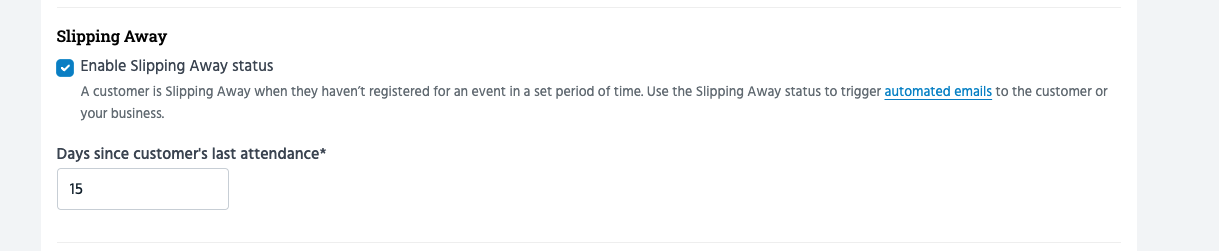 In the example below, customers who haven’t been to class in the last 15 days will be automatically classified as customers that are "slipping away".