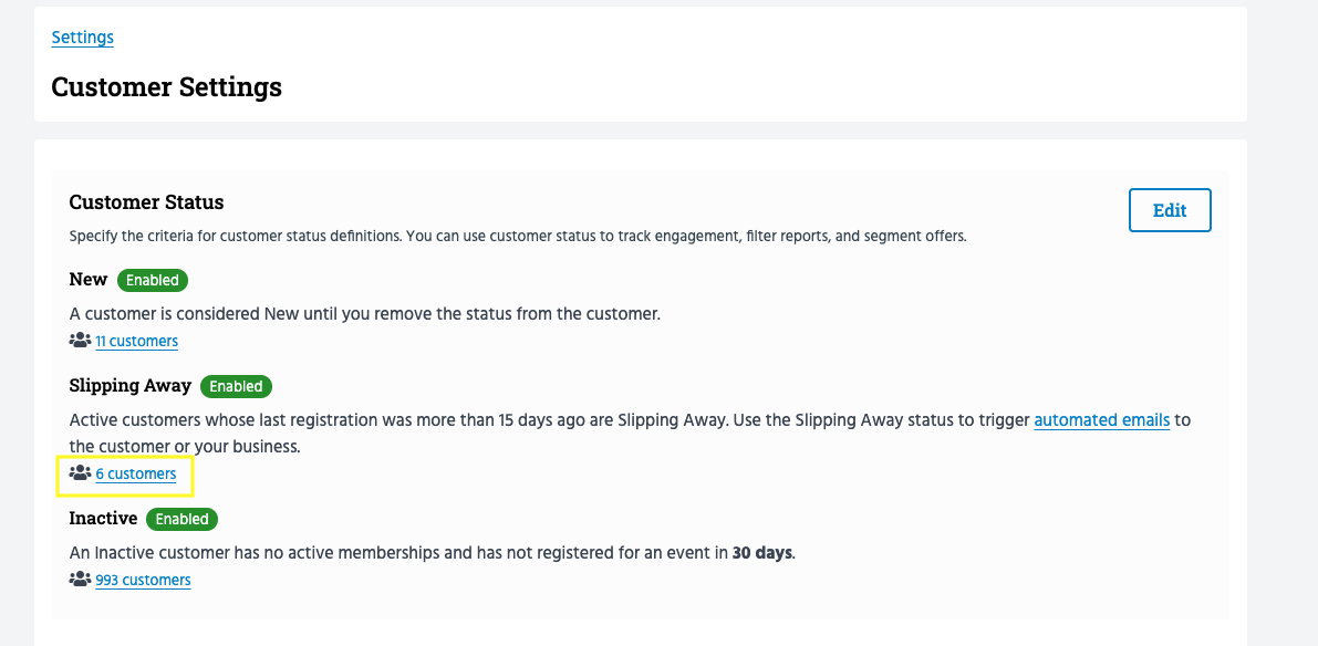 Direct link to the slipping away customer list. Head to Settings >> Customers and click the customers below 'Slipping away' for a filtered list of these customers.