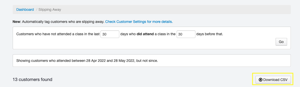On this page, you’ll be able to view customers who haven’t attended any classes within a specific time frame.