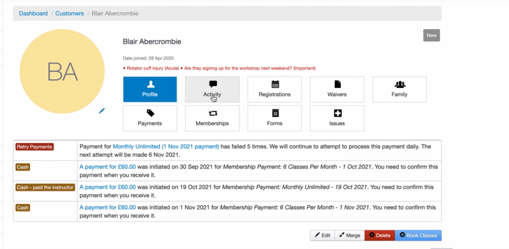 Registrations - see who's registered for class that day or for future sessions. All class registrations are time-stamped allowing you to see how far in advance they signed up.