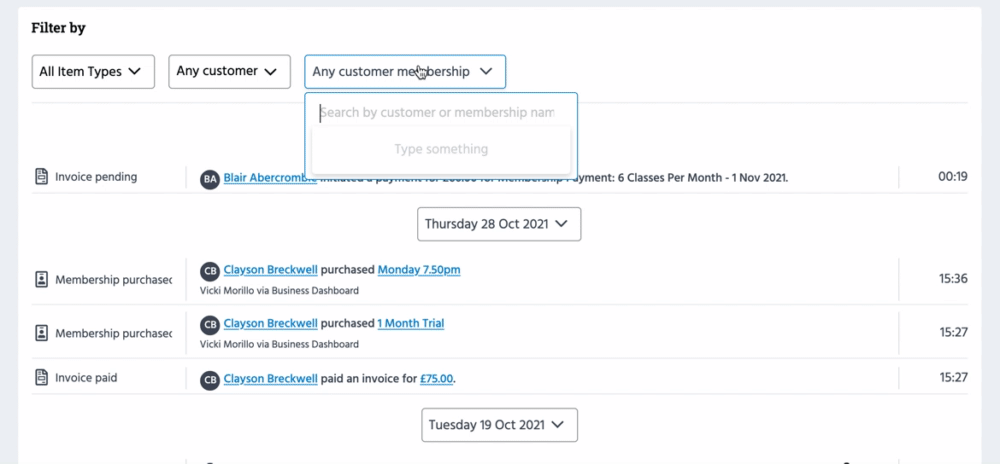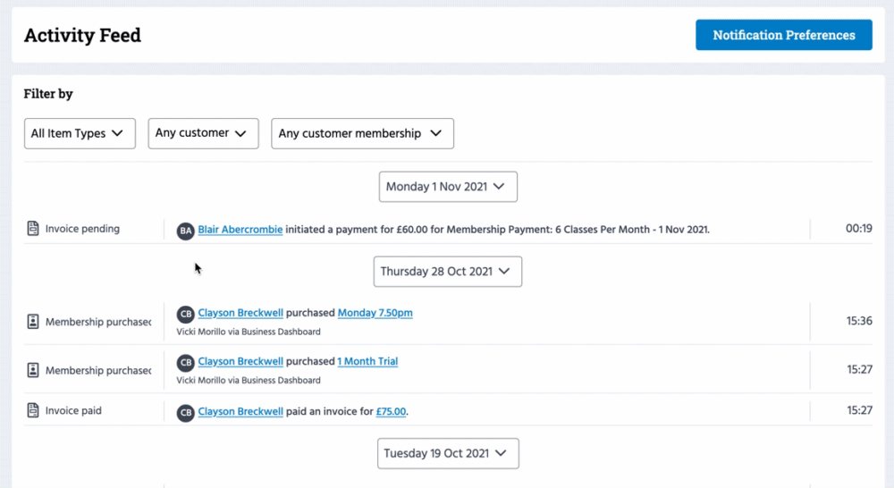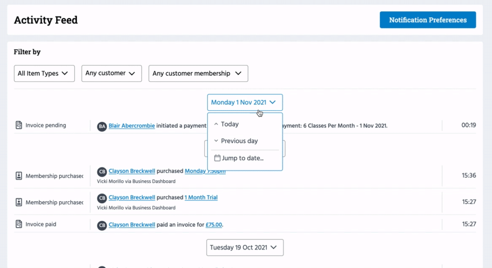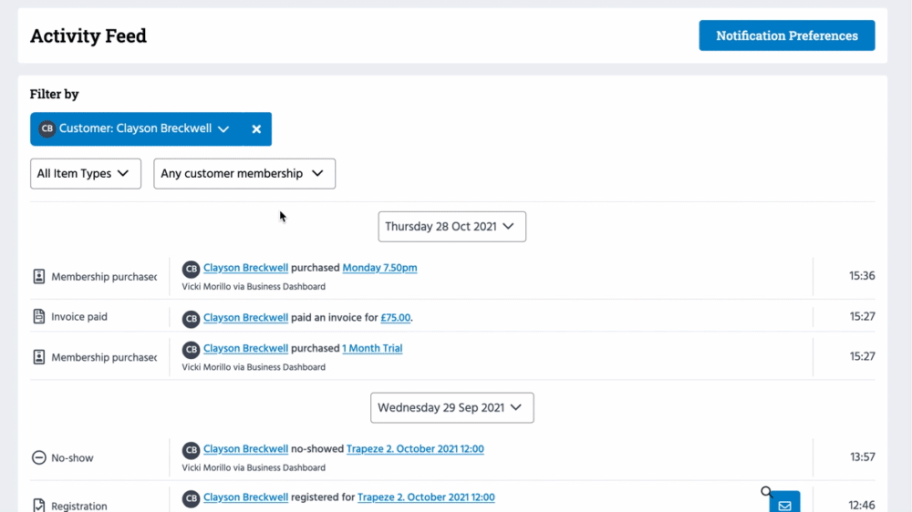 The Activity Feed allows you to check your customer activity in one place. Using the many filters you can monitor registrations, membership purchases, notifications, and much more.