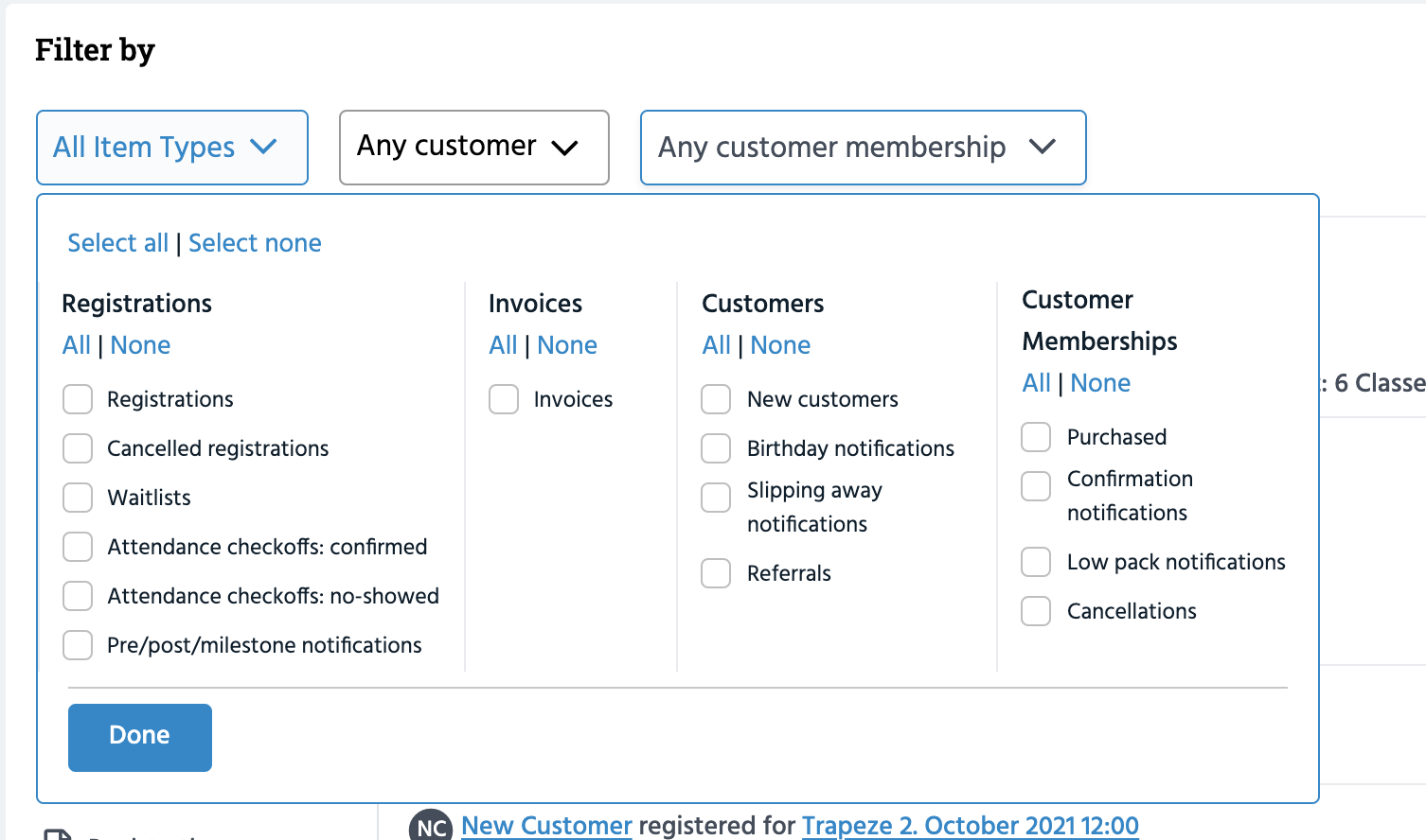 The 'All Item Types' filter is a menu that allows you to select a combination of which items and activity you would like to see within your feed. You can select/deselect Registrations, Customers, Customer Memberships, Invoices.