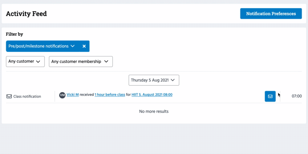 Pre/post/milestone notifications - see who received a pre or post class email, or a reminder that they will be hitting a milestone at your gym or studio. Note: these emails will only get triggered up if you've got pre/post/milestone notifications set up.