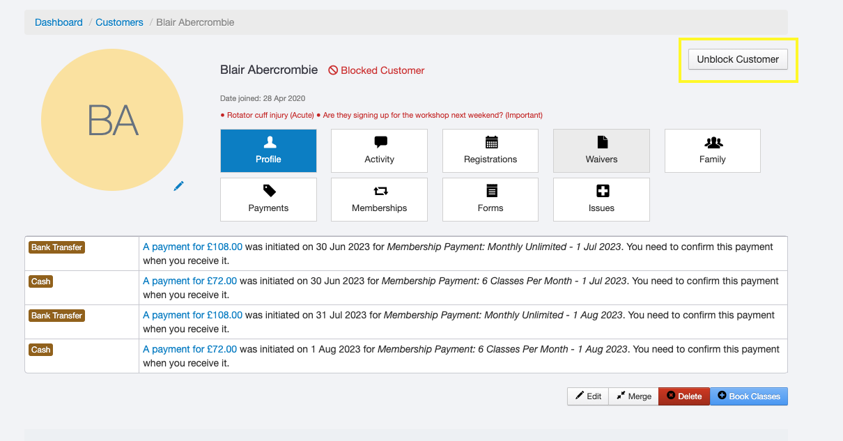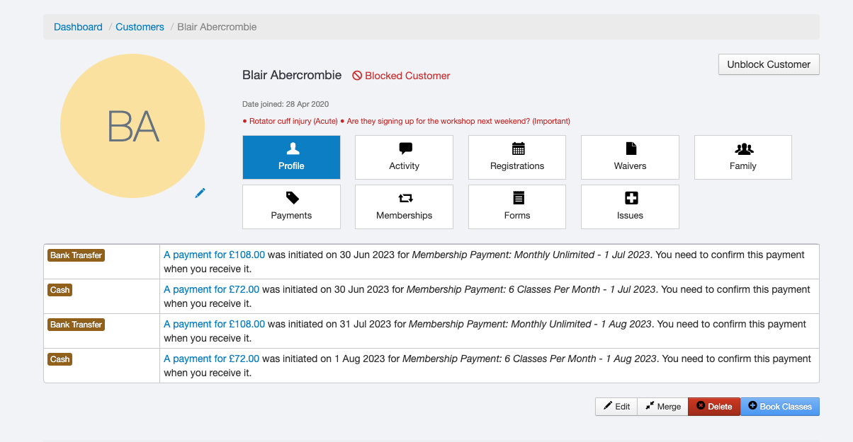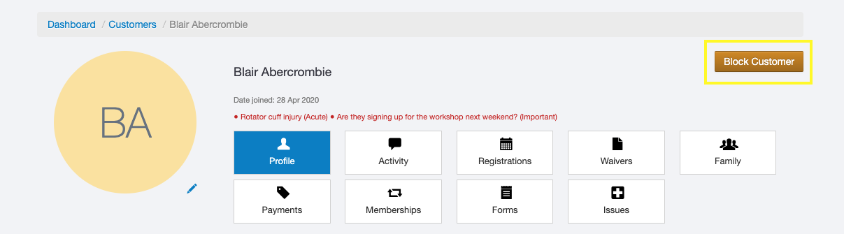 Once done, the customer will show as blocked on their profile, and they won't be able to make any bookings until they are unblocked by a member of staff.