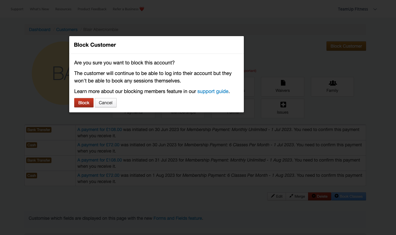 The 'Block Customer' functionality allows you to instantly block members from booking classes, appointments, and courses. Blocked customers can still purchase memberships and store items while blocked.