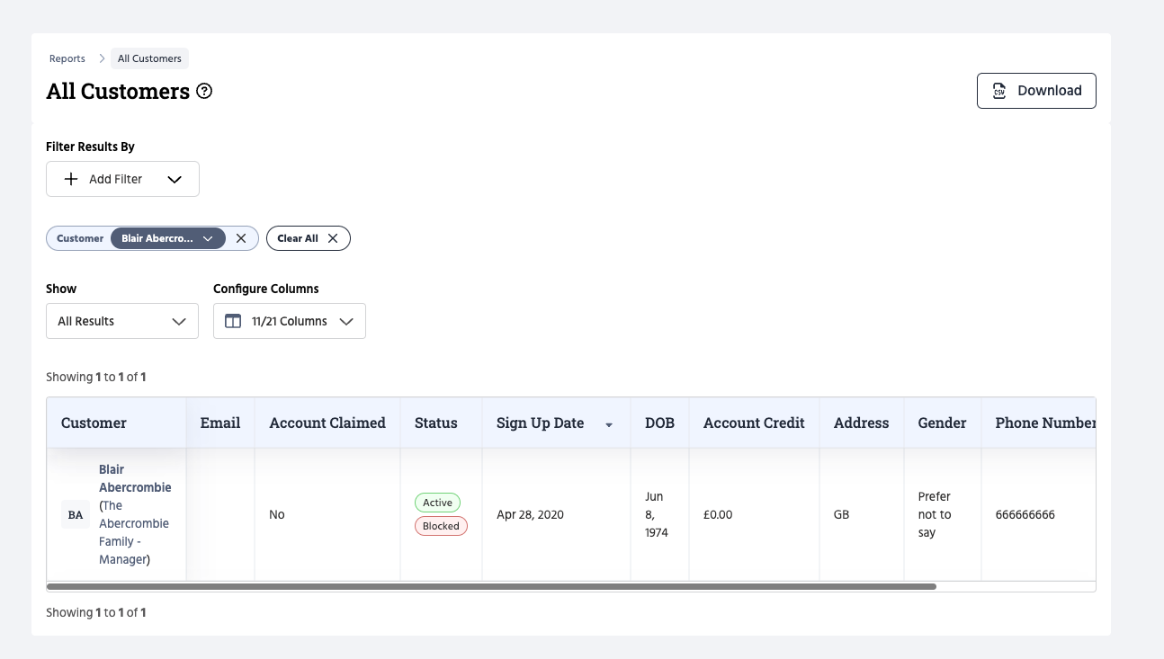 Blocked customers will also be flagged in the All Customers Report, as seen below.