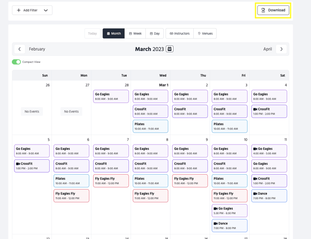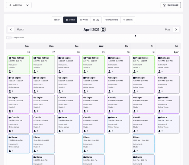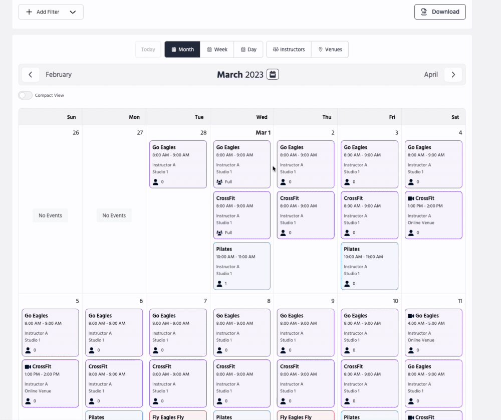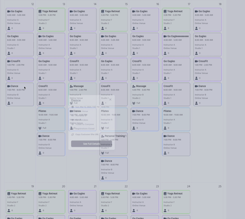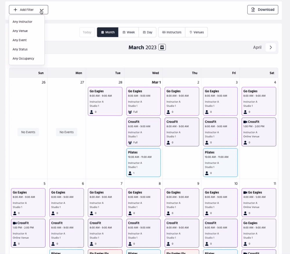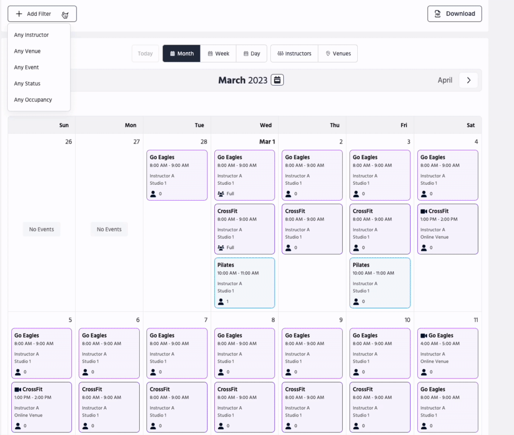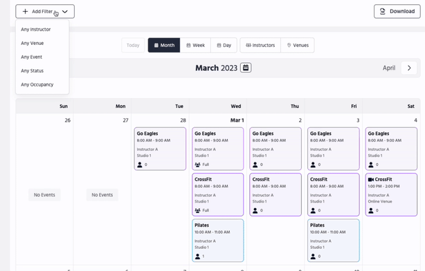 By default, the Calendar will show all your events (classes, courses, and appointments), but you can filter by specific instructors, venues, event types, status (active and/or canceled classes), or occupancy (empty, has registrations, full, has waitlist) if you need to narrow down the view.