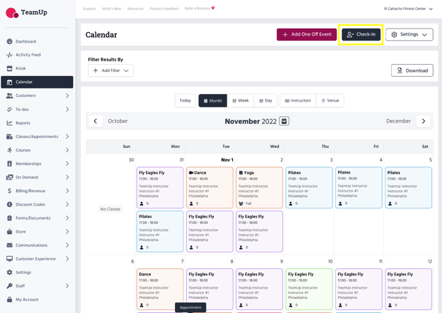 TeamUp's business management calendar allows business owners, instructors, and other staff members to see your class schedule*, access class details and attendees, check off attendance, and much more.