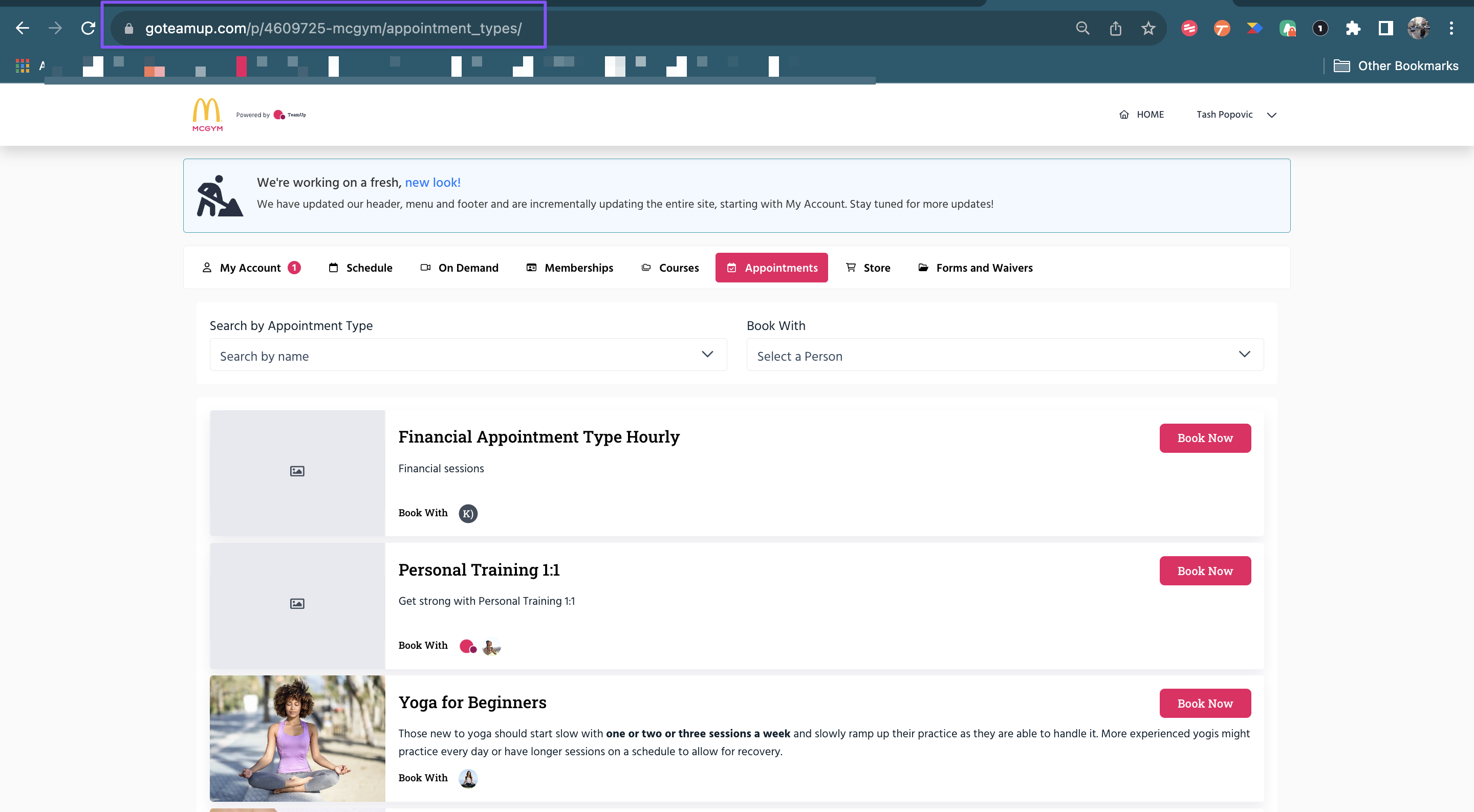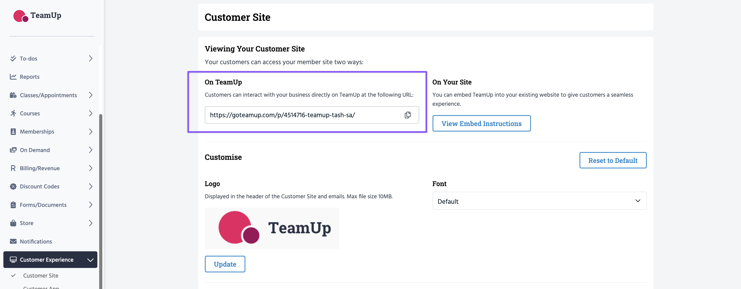 Your TeamUp Customer Site has its own unique URL. This link can be shared for customers to sign up for your business or log back in.