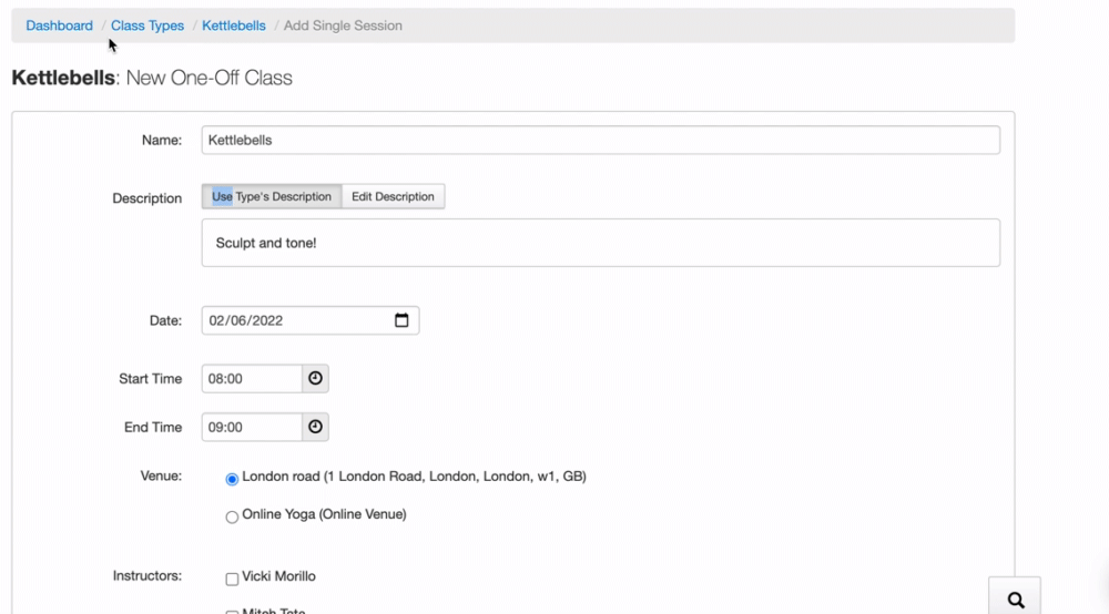 To do this, you'll need to create a new single session on 2nd June from the Kettlebells Class Type and select the "Relax" option, as seen below. For detailed instructions on how to create a one-off class, see How to set up a class.