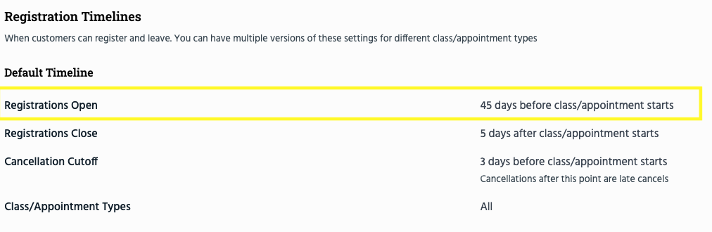 Registration timelines determine when customers can start booking classes or appointments. This is done via the "Registrations Open" setting, which allows you to set how far in advance a class type can be booked.