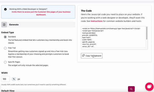 💡 Note that the code on the side changes as you select the different default view and venue options. Once you have the desired combination, click 'Copy code'.