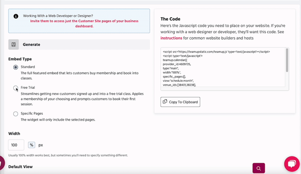 You can use this widget to help promote your business/free trial on social media; for example - customers will be able to sign up for their free class in just a couple of clicks. To install this widget, please see How to set up TeamUp's free trial widget. Streamlines getting new customers signed up and into a free trial class. Applies a membership of your choosing and prompts customers to book their first session.