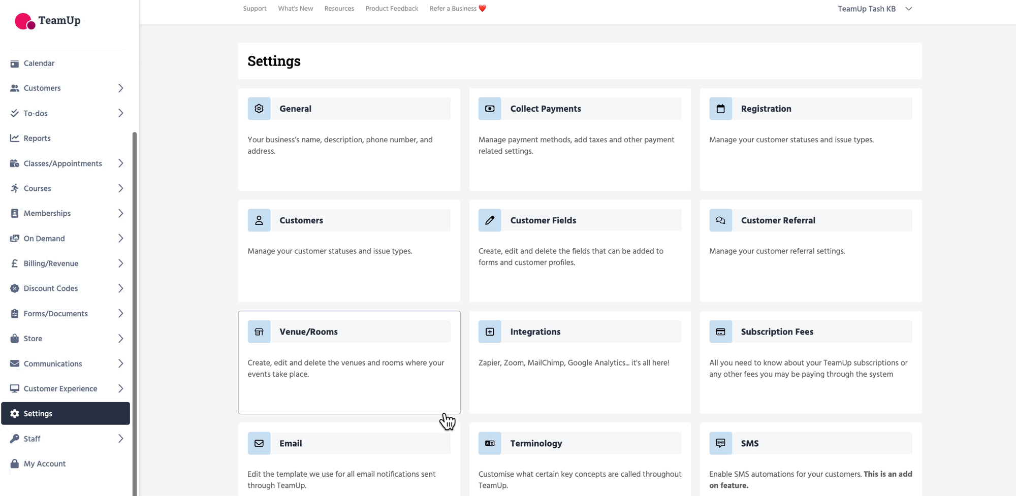 1. Integrate your TeamUp account with Zoom. To do this, head to Settings >> Integrations.