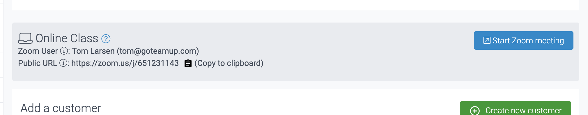 Configure a venue on TeamUp to automatically create a Zoom meeting URL/link for each class that takes place at that venue.