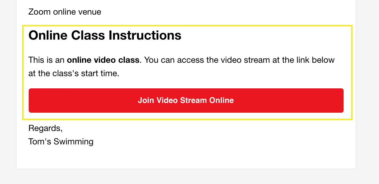 Class registrants will receive the video link in their registration confirmation email, in addition to being able to open the video stream from the class detail page on your Customer Site.