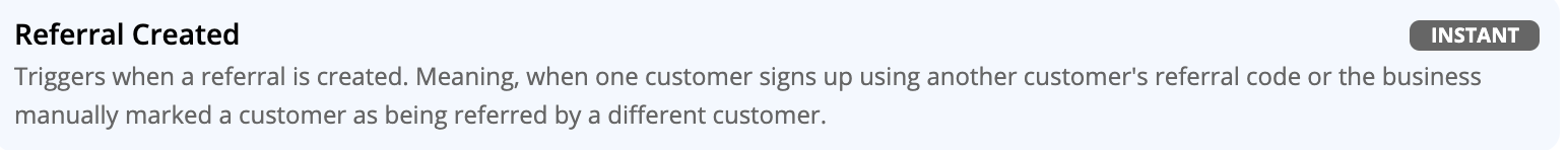 Referral Created runs when a new customer signs up using another customer's referral code or when you mark a customer as being referred by a different customer from your end.