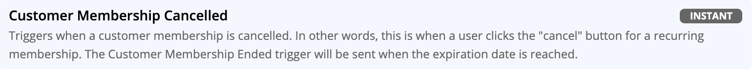 Customer Membership Cancelled runs when a customer membership is cancelled. This is sent when a user clicks the “cancel” button for a recurring membership.