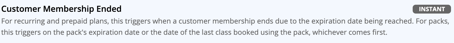 Note. Customer Membership Ended will also be triggered for packs on either the expiration date or the date of the last class/appointment it was used for, whichever comes first.