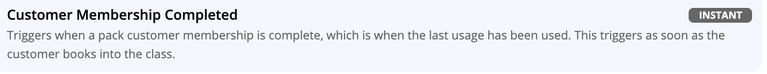 Customer Membership Completed runs when a pack customer membership is complete, which is when the last usage has been used.