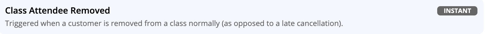 Class Attendee Removed runs when a customer unregisters from a class/appointment within the allowed cancellation period, i.e., doesn't late cancel, or when you remove them from a class/appointment from your end and mark them as a regular cancel (as opposed to a late cancellation).