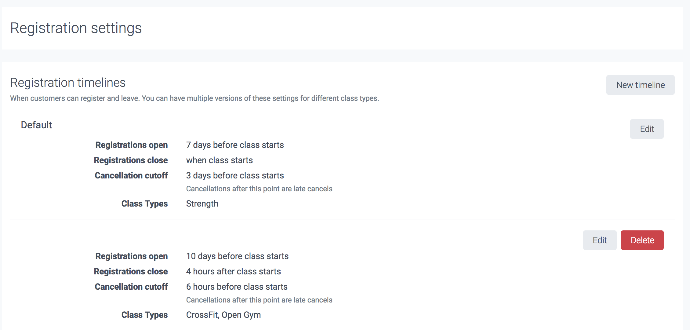 The booking and cancellation settings can be global for all offerings, or they can be customised for each class type by creating multiple 'Registration timelines'.