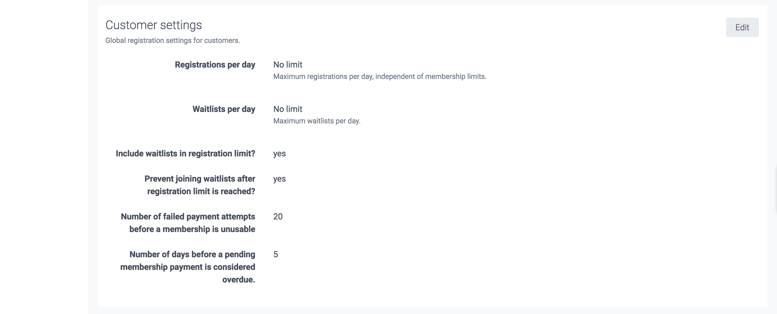 Global registration settings for customers - such as maximum, number of allowed failed payments before their membership is unusable, etc. - are controlled from 'Customer settings'.