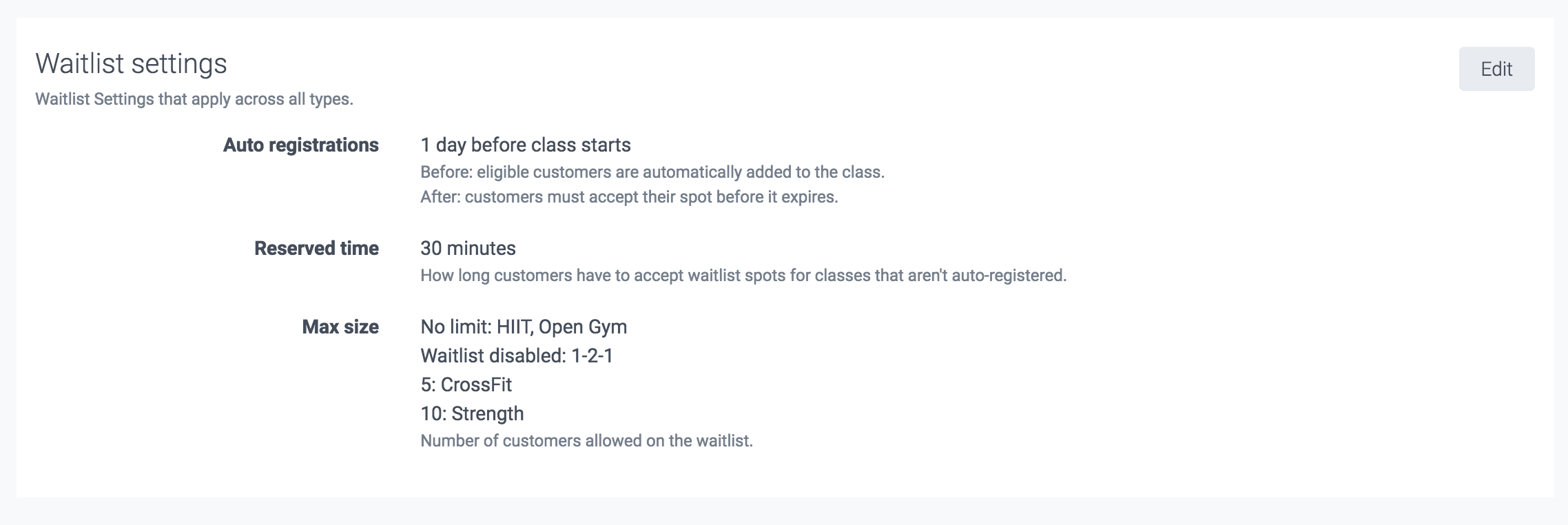 The 'Waitlist settings' determine whether a class type has a waitlist, its size, and how long your customers have to accept a spot if they're not eligible to be auto-registered.
