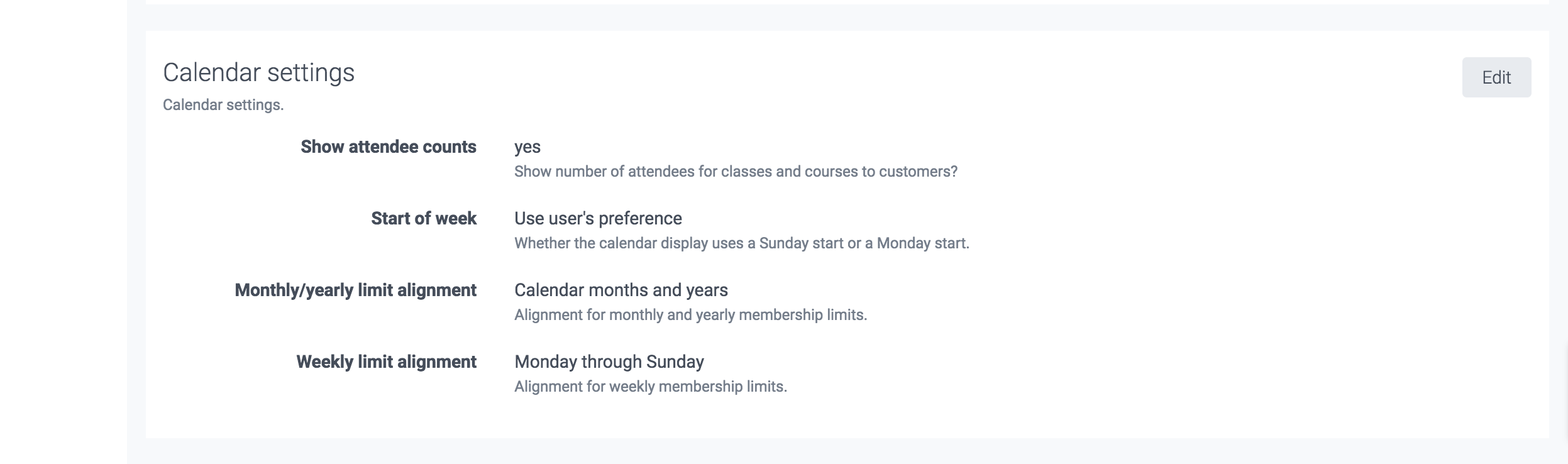 From 'Calendar settings' section, you can also edit certain calendar settings, such as whether you want to display your attendee counts, which day of the week it should start on, etc.