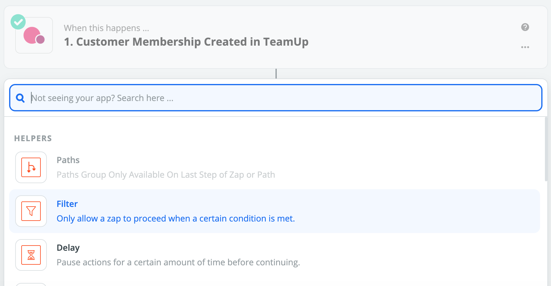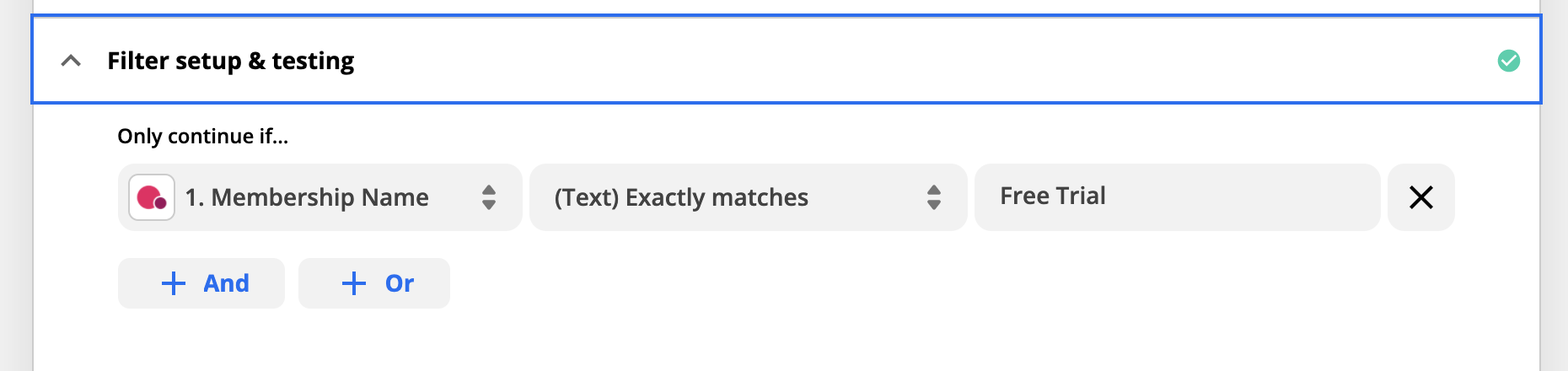 Filters are a way to ensure Zaps proceed only when certain conditions are true. For instance, you might want your Zap to send just for specific membership purchases, or have one Zap for trial membership purchases and another for all other membership purchases. With Filters, you set a specific condition and the Zap will only continue if it meets that condition.