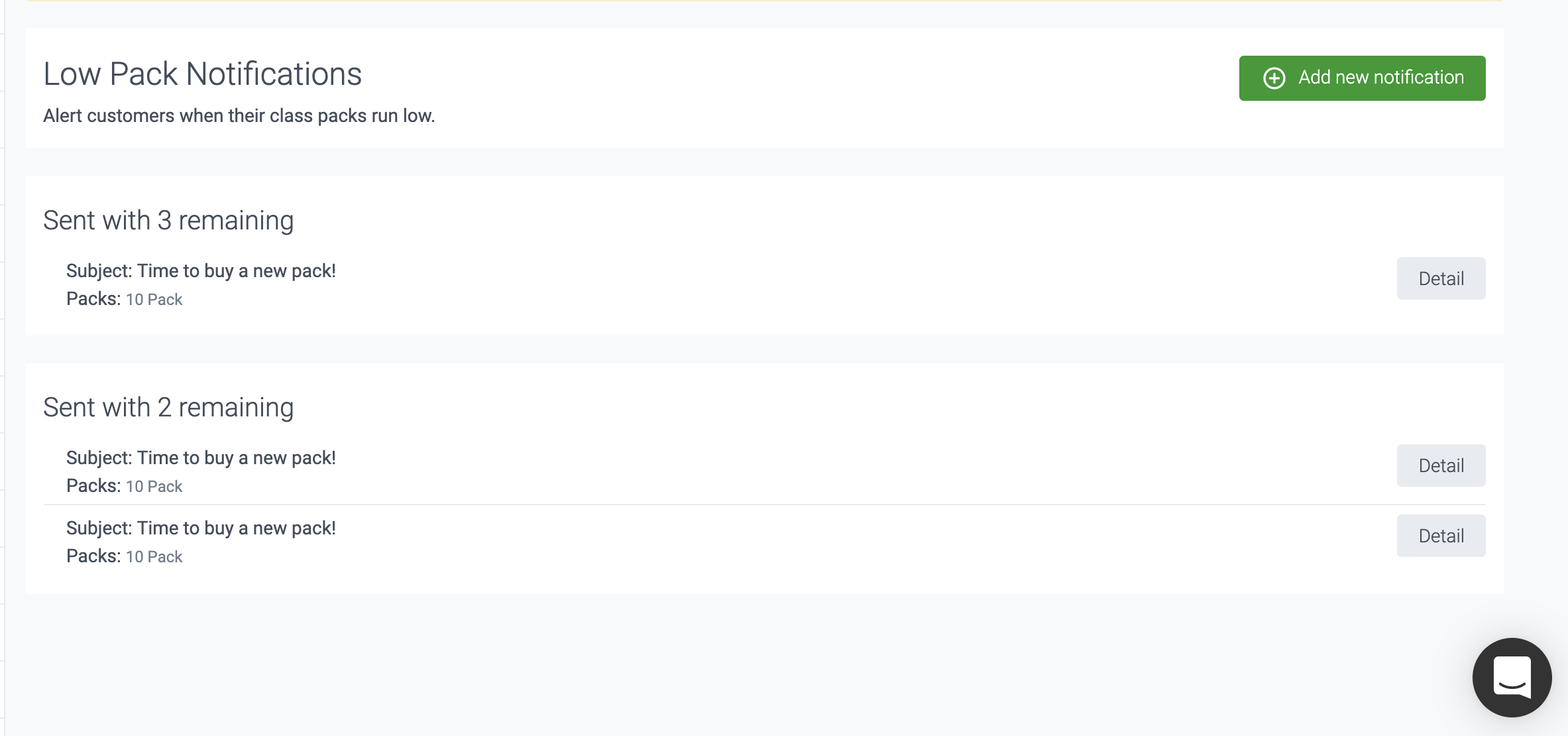 To view your existing Pack Running Low notifications, head to Notifications >> Memberships >> Low Pack Notifications.