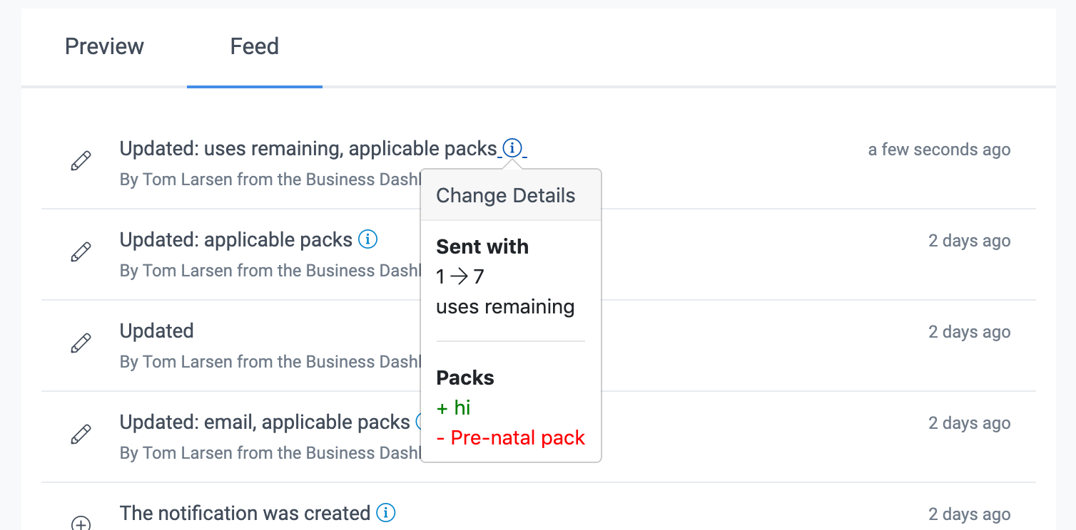 Each notification has an activity feed. This feed shows items for:
