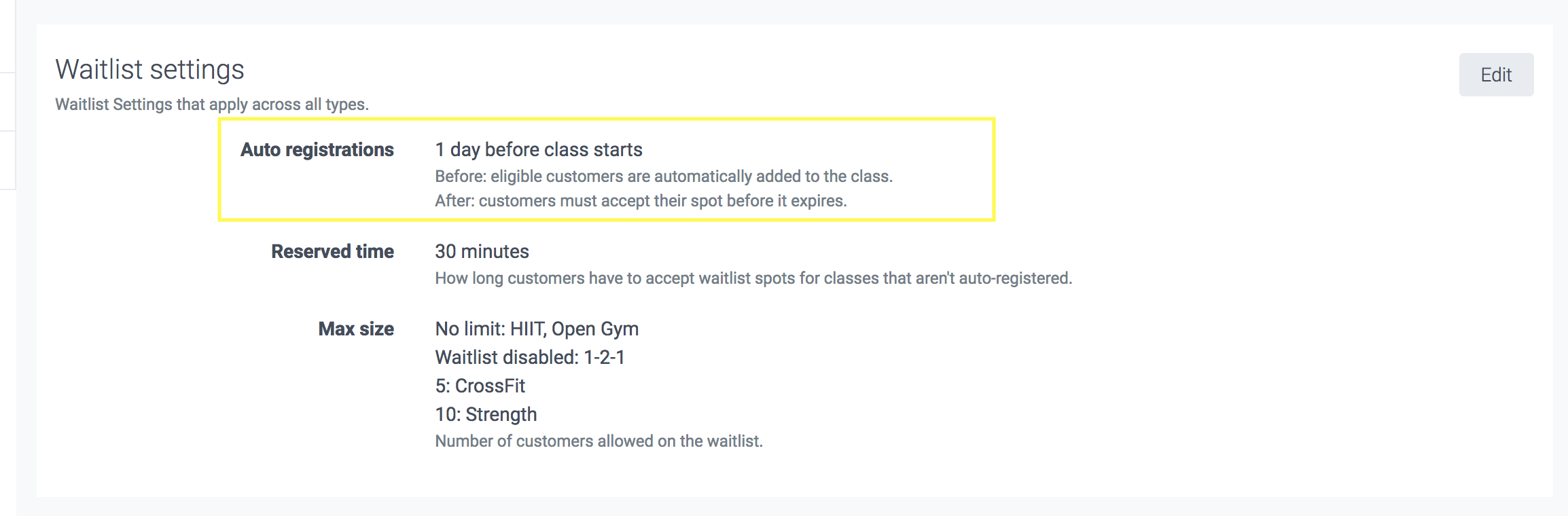 The auto-registration setting is 1 day, so if a spot opens more than 1 day before the start of the class, customers will be automatically added to the class, provided they have filled in all the relevant forms, signed the waivers, hold an applicable membership for the class and have credits left to use.