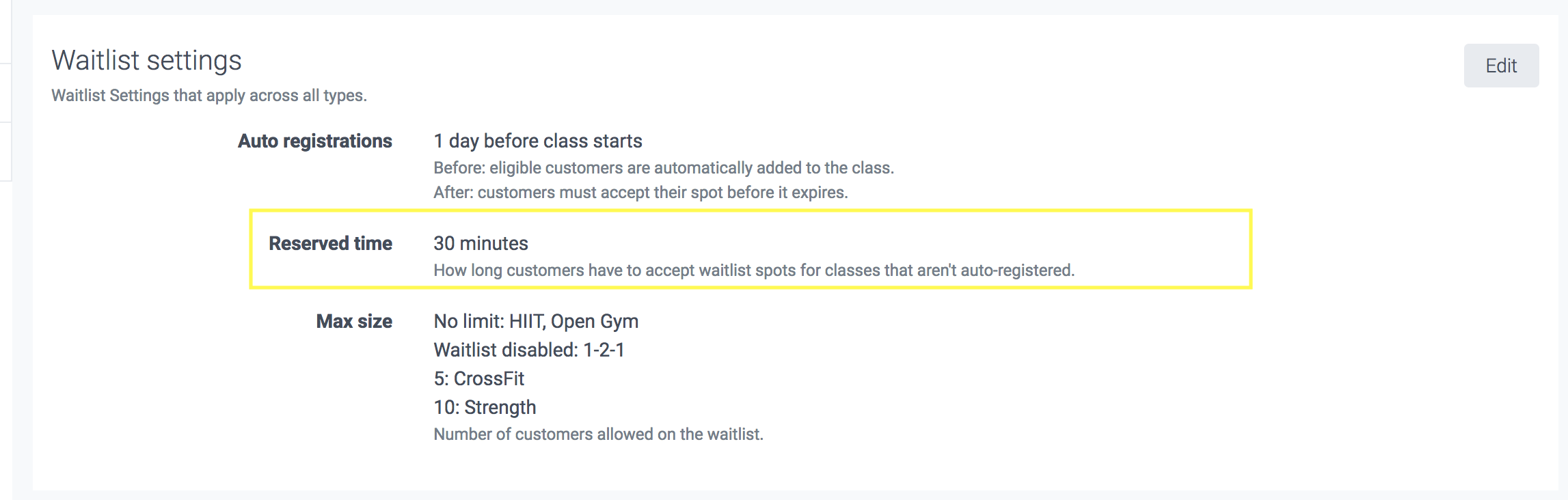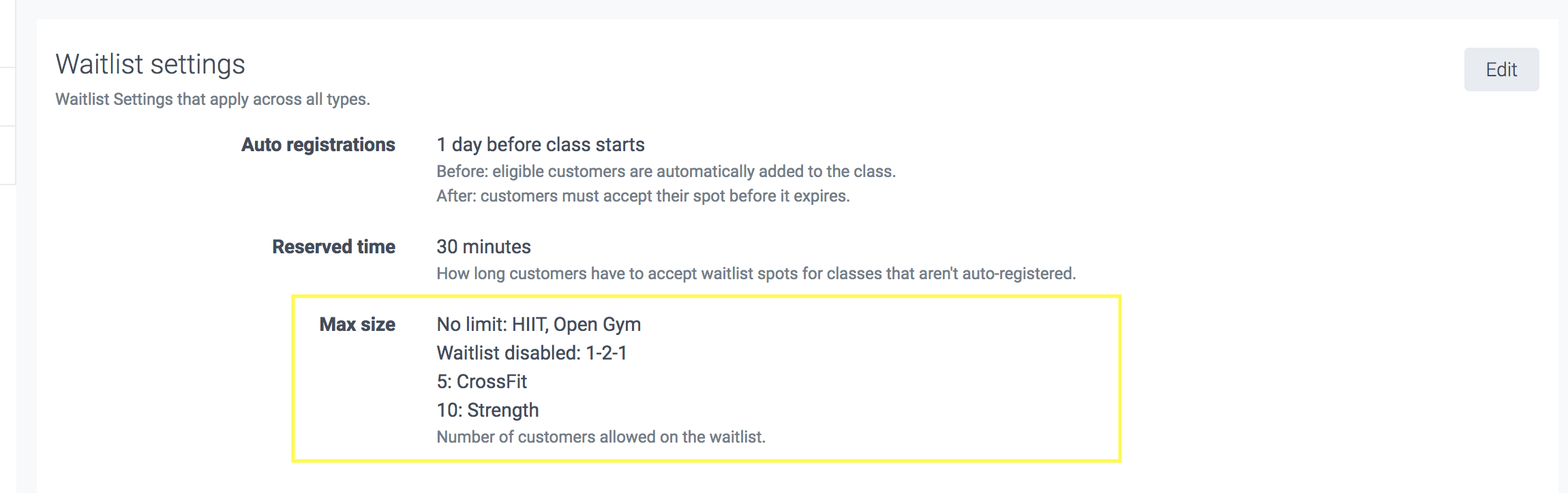 For the below example, there is a 10 person maximum for the waitlist of CrossFit, and no maximum limit set for Barbell express: