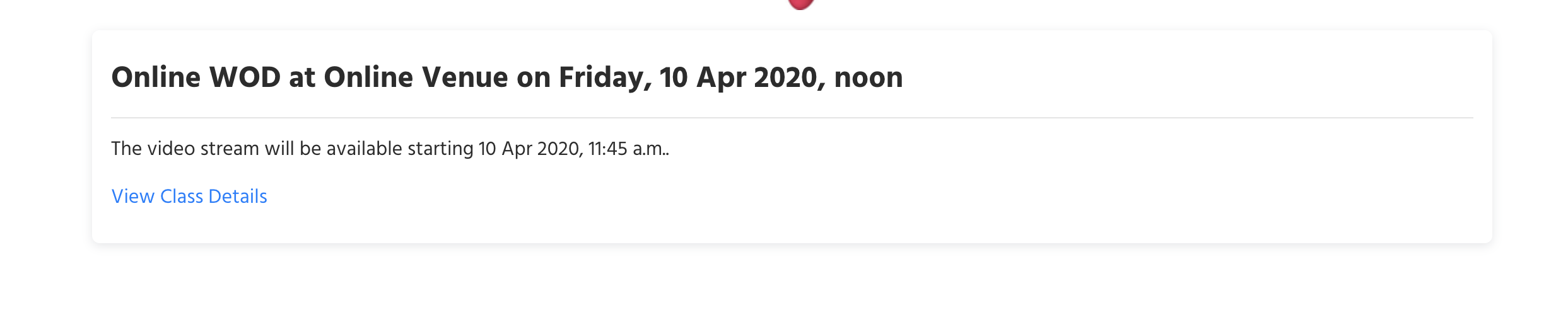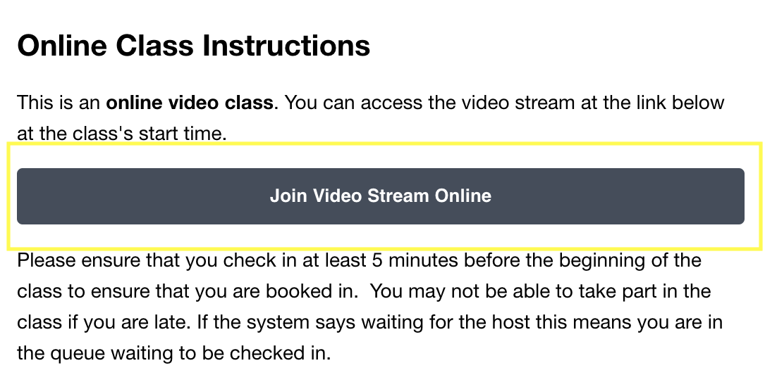 From the email. Customers can also join the class from the confirmation email we saw above, or the pre-class reminder email if you've got this notification set up. In both cases, customers will see the 'Join Video Stream Online' button in the email.