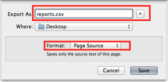 Change "Format" to "Page Source". You'll notice the file extension in the file name line change to .csv. Highlight the name of the file so you can rename it: