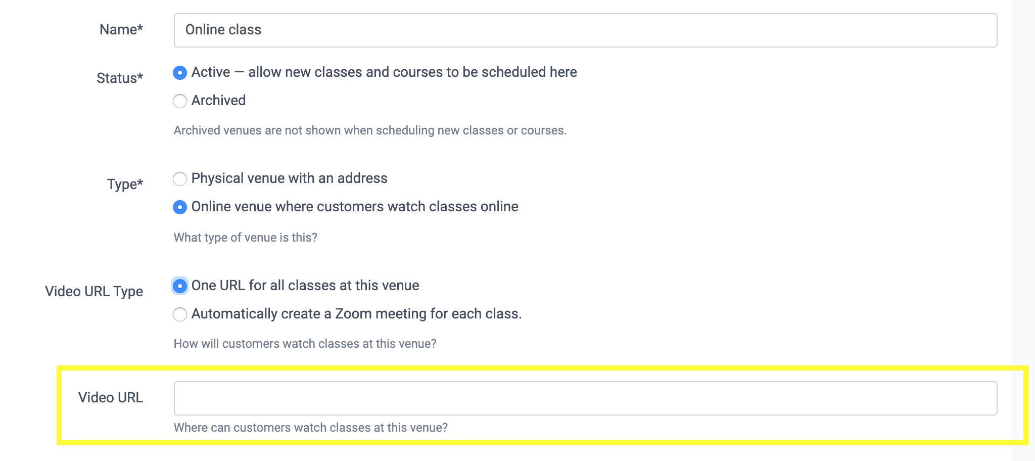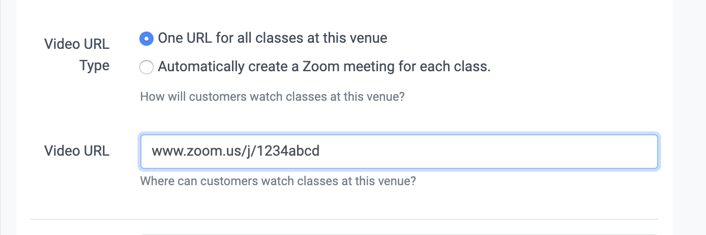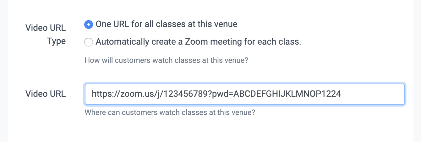 you may want to update your venue in TeamUp to avoid customers being asked to enter a password to enter meetings. This applies to you if your Video URL Type is "One URL for all classes at this venue" and your Video URL is a Zoom URL without a meeting password included. Your venue might look something like the below.
